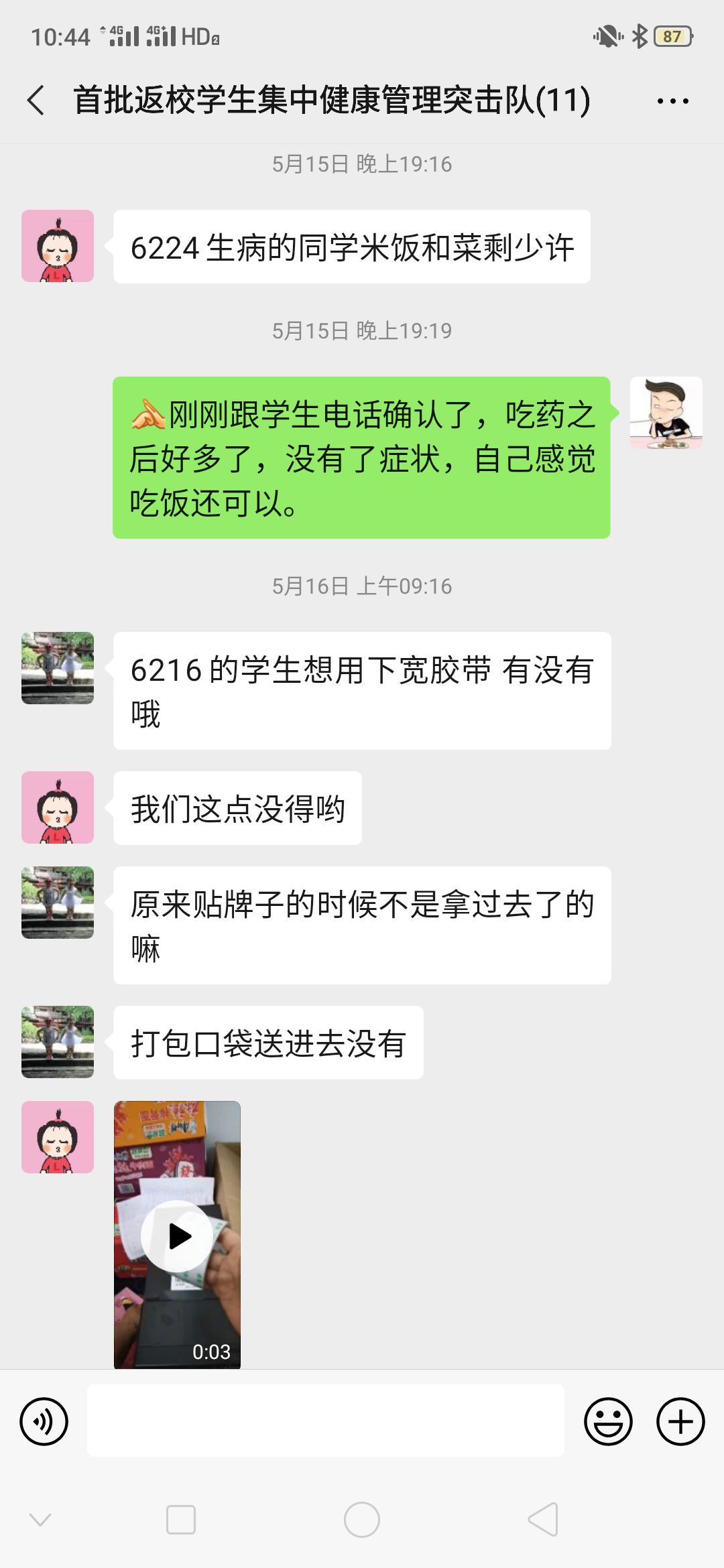 雷火竞技官方网站第三党支部教师党员、辅导员尹博老师作为其中一员参与了5月14日至5月18日期间的健康管理工作。值班期间,尹博老师主动帮助员工、协助医务室进行体温检测、时刻关注员工身心健康、汇总员工的健康管理台账,并时刻准备应对可能遇到的突发情况,为员工做好服务工作,保证员工在集中健康管理期间的正常学习和生活。“老师,我想用一下指甲刀”、“老师,麻烦帮我取一下快递”、“老师,我这边差一双筷子”……这是值班期间的工作日常,琐碎,但意义非凡。
