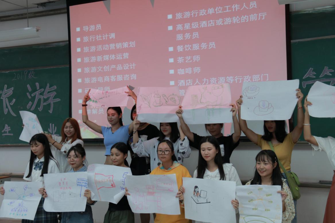 “爱行业、爱岗位”环节是让新生亲自参与互动游戏——“解密旅游管理专业就业岗位”:将新生分为15个组,每组讨论旅游管理专业的就业岗位,如导游员,旅行社计调,旅游活动营销策划、旅游新媒体运营、旅游文创产品设计、旅游电商客服咨询、研学导师、餐饮服务员、茶艺师等所需的知识,技能和素质,并在准备好的画纸上用简单的图案表达这个岗位,最后推选出1到2名同学上台来,用一分钟的时间向大家解释所画图案的含义。通过这个环节,不仅体现了新生团队合作精神和创新创意能力,也让新生们对旅游管理专业未来的就业方向及岗位有了初步的认知。