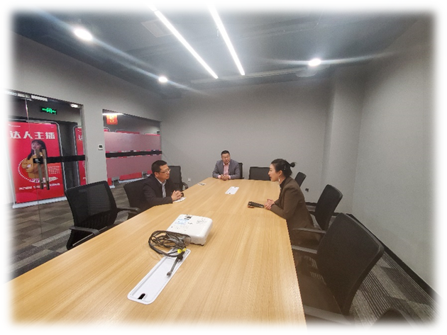 校企领导见面后,黄翔经理在京云直播张澜总监的带领下参观了公司重金打造的2000多平米的直播间,了解主播们平时的工作日常状况,随后校企双方在会议室进行深入的交流。会间京云直播李晓总经理详细介绍了公司现状、发展规划以及人才需求,黄经理也向公司高层介绍了学院的情况以及人才培养的概况。校企双方就如何做好直播人才培养,如何利用好直播行业的风口期促进员工的就业创业活动,以及营销相关专业未来在人才培养和专业定位如何进一步突破等问题进行了为期3个多小时的深入沟通与交流,校企双方达成了一定的共识,愿意进行下一步的合作尝试。同时黄经理也邀请公司领导在适当的时间到学校、学院进行进一步的交流与沟通,最后校企双方合影留念。