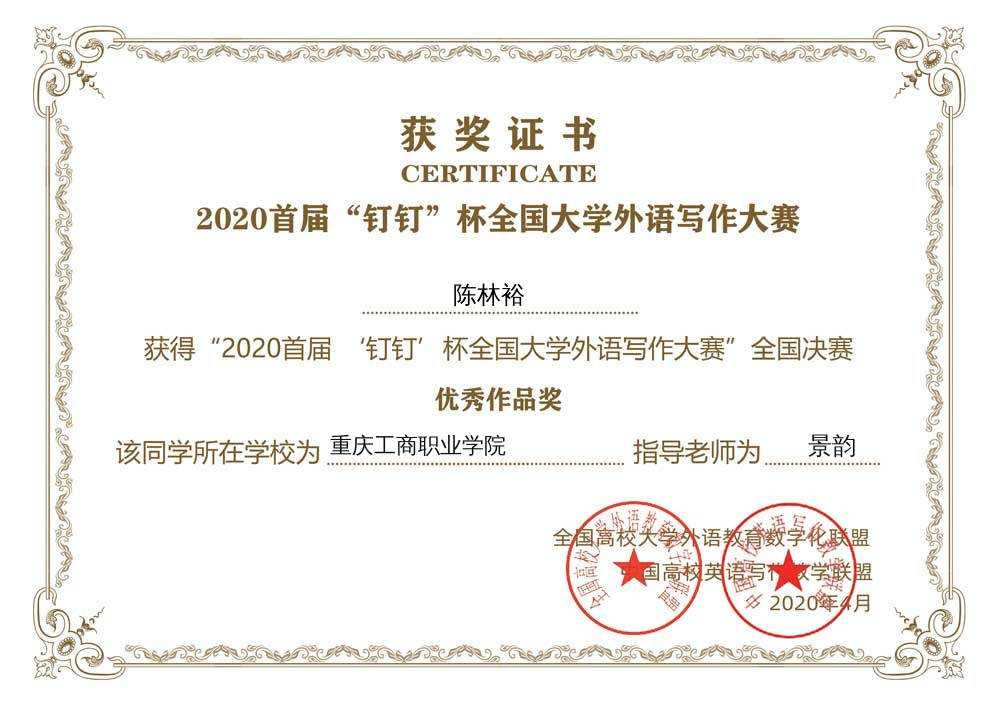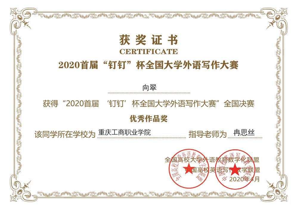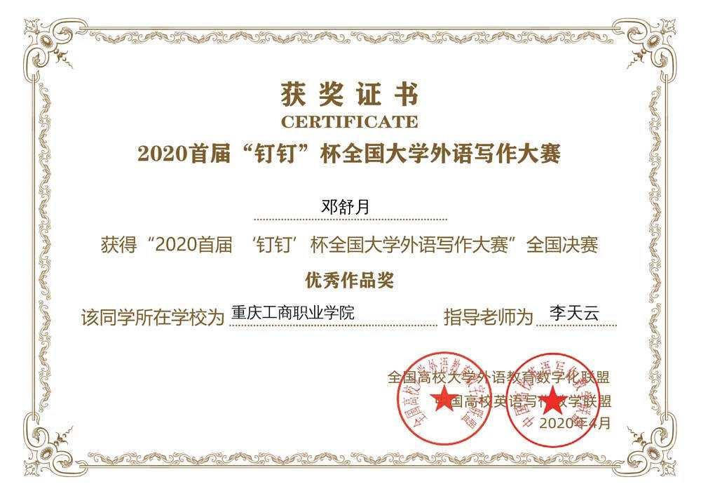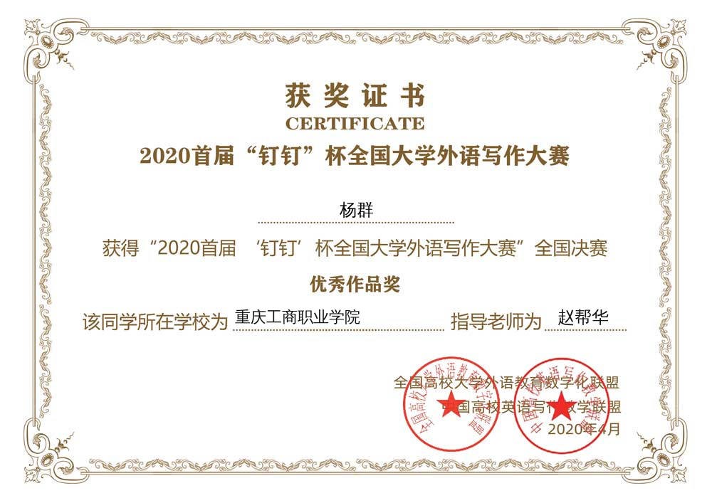 疫情期间,为了激励同学们“宅家”不停学,商英教研室教师积极鼓励商英学子参加了“钉钉”杯全国大学外语写作大赛,通过比赛提高同学们学习的动力。此次大赛全国约有3000支队伍30万人参加。公司商英学子90多人参赛,不负众望,在初赛中表现不凡,突破重围,一举入围大赛决赛。