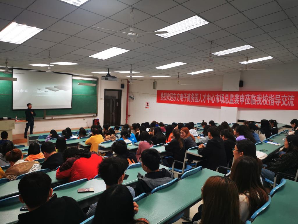 11月4日,雷火竞技官方网站2018级电子商务、国际商务专业举办了就业指导讲座。本次讲座特邀杭州东方电子商务园人才中心市场总监、赢动教育集团数字产业学院市场总监裴申就电子商务专业的就业优势以及杭州电商运营经营精准实习项目的具体流程、电商企业资源及项目开展意义等方面给员工作指导。此次杭州电商运营经营精准实习项目主要面向18级电子商务、国际商务专业在校准毕业生,员工报名后将在杭州东方电子商务园区内进行为期六天的电商实习训练,并于内部考核后,开展进一步实习或实现优质就业。
