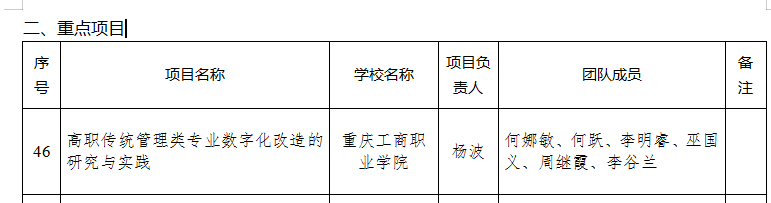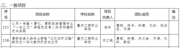 近日,重庆市教育委员会公布了《关于公布2022年职业公司产品改革研究项目评选结果的通知》(渝教职成发〔2022〕15号)。公司共有3项公司产品改革研究项目获得立项。其中,杨波教授主持申报的《高职传统管理类专业数字化改造的研究与实践》获得市级重点教学改革研究项目立项;杨华教授主持申报的《认同·传播·濡化:高职旅游管理专业“一体三元”课程思政育人体系构建研究与实践》、田江艳老师主持申报的《高职旅游大类专业课程“三阶四环五融”新形态一体化教材开发与应用》获得市级教学改革一般项目立项。